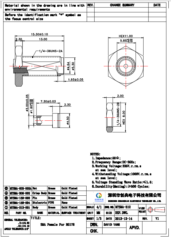 射频同轴镀金连接器SMA-312 线端直式50欧姆SMA母头母针频率范围0-6G,IP67防水 接线1.13直径