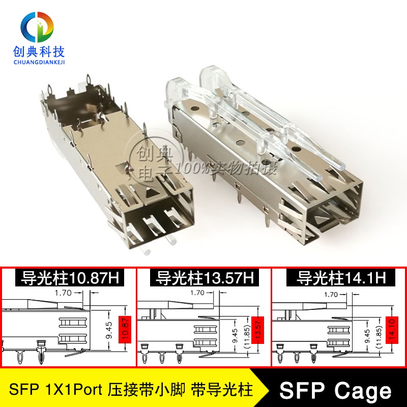 SFP千兆光笼子1X1Port鱼眼脚压接式带月牙小脚带PC透明导光柱10.87H&13.57H&14.1H光模块接口SFP Cage光纤插槽屏蔽罩