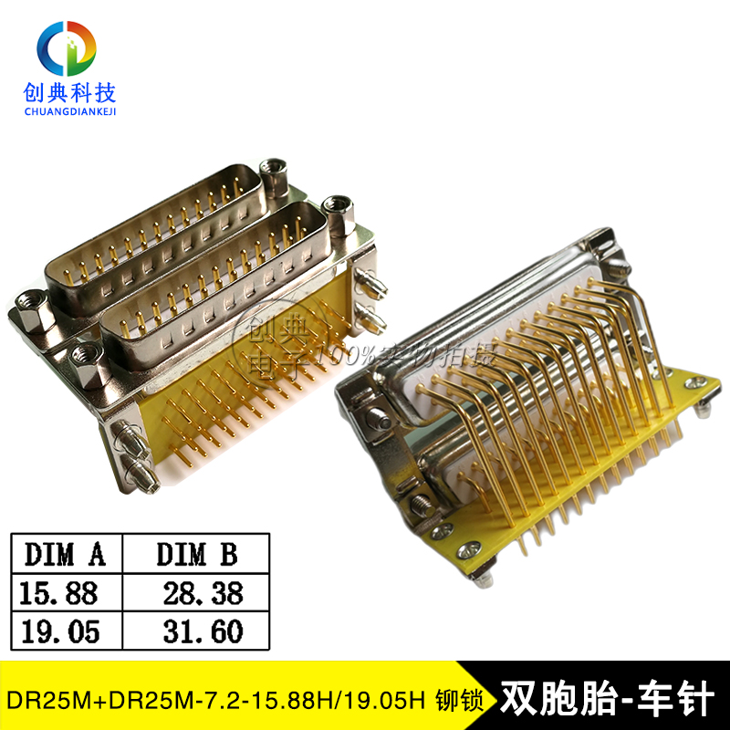 DR25公对DR25公 DB25M+DB25M双层D-SUB双胞胎VGA实芯车针铆金属支架带黄色塑胶挡板锁4.8/5.8铁螺丝-15.88H&19.05H